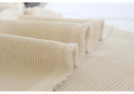 コーデュロイとは、丸い円を描いた糸を織り出すパイル織りの一種で、ループをカットして毛羽立たせた生地です。縦に畝(うね)があり、表面の毛羽による凸凹した立体感が特徴で、別名コール天とも呼ばれています。コーデュロイは、保温性が高く、秋冬用のパンツやジャケットによく使用されます。肉厚で、表面の毛羽が短いながらもふわふわしていることも特徴で、畝の凹凸の中に空気を含むため、吸湿性にも優れています。仕上げにローラーで焼くことによって、光沢感を出しているのも特徴です。