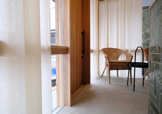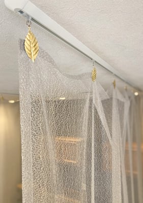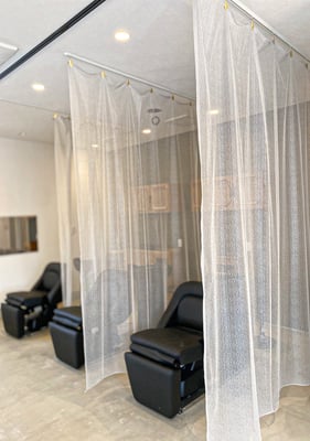 シャンプースペースの間仕切りはその特別な雰囲気をより感じさせるよう、センスの良いお客様チョイスの生地と、主張し過ぎず、生地そのままの風合いを生かすクリップカーテンで表現。