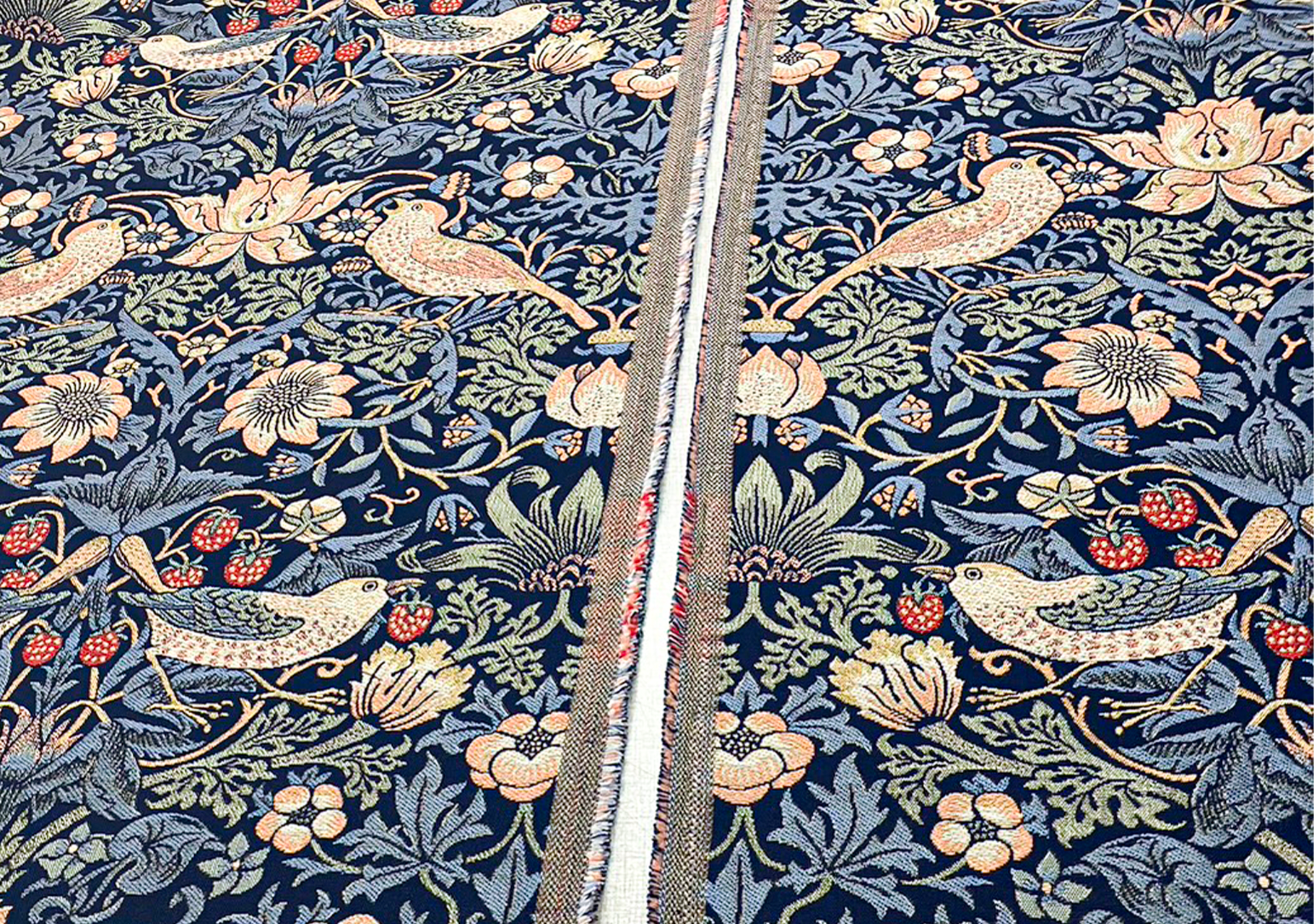 一般的には大きな窓にかけるカーテンを作る際に生じる縫製で、生地の耳同士をつなぎ合わせて1枚状の大きな生地にするのですが、柄物の生地の場合は柄合わせが必要となります。