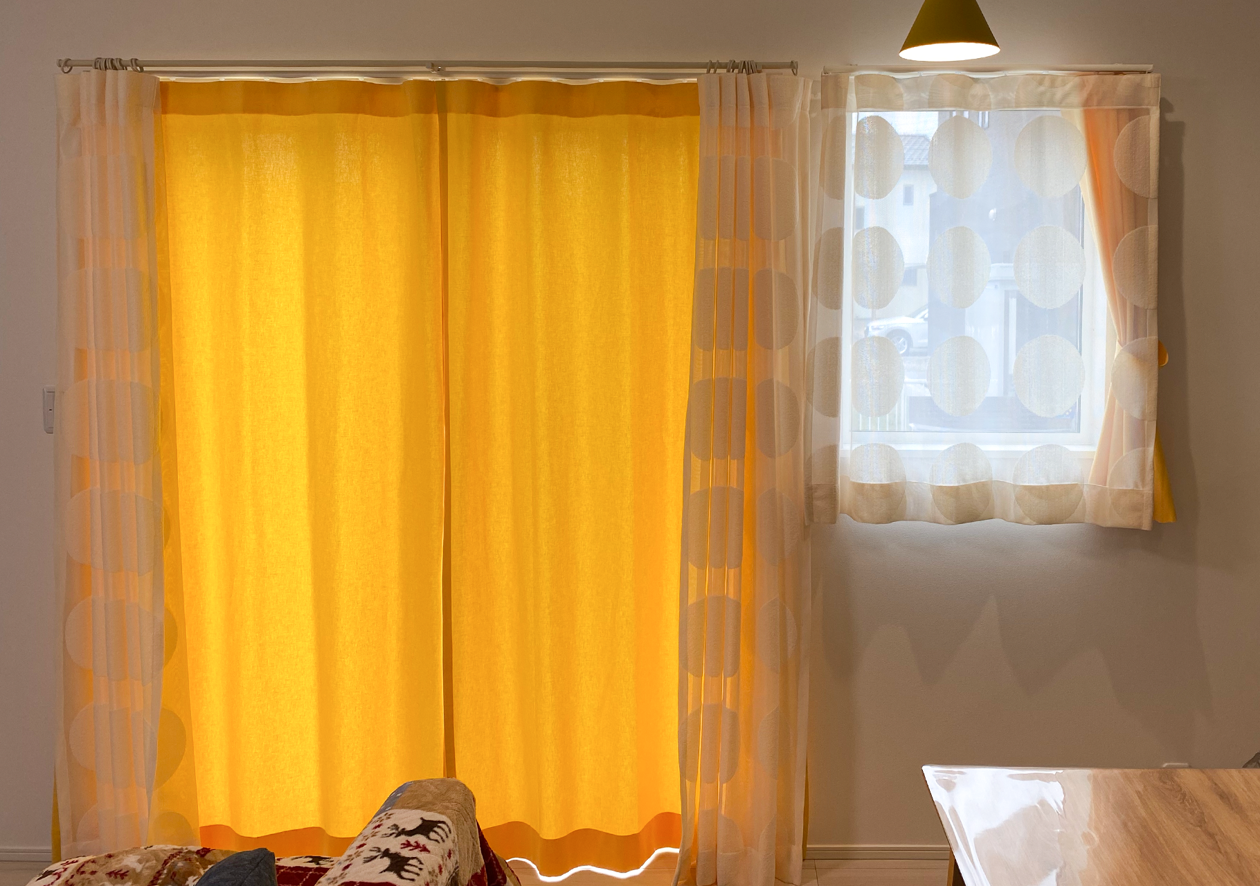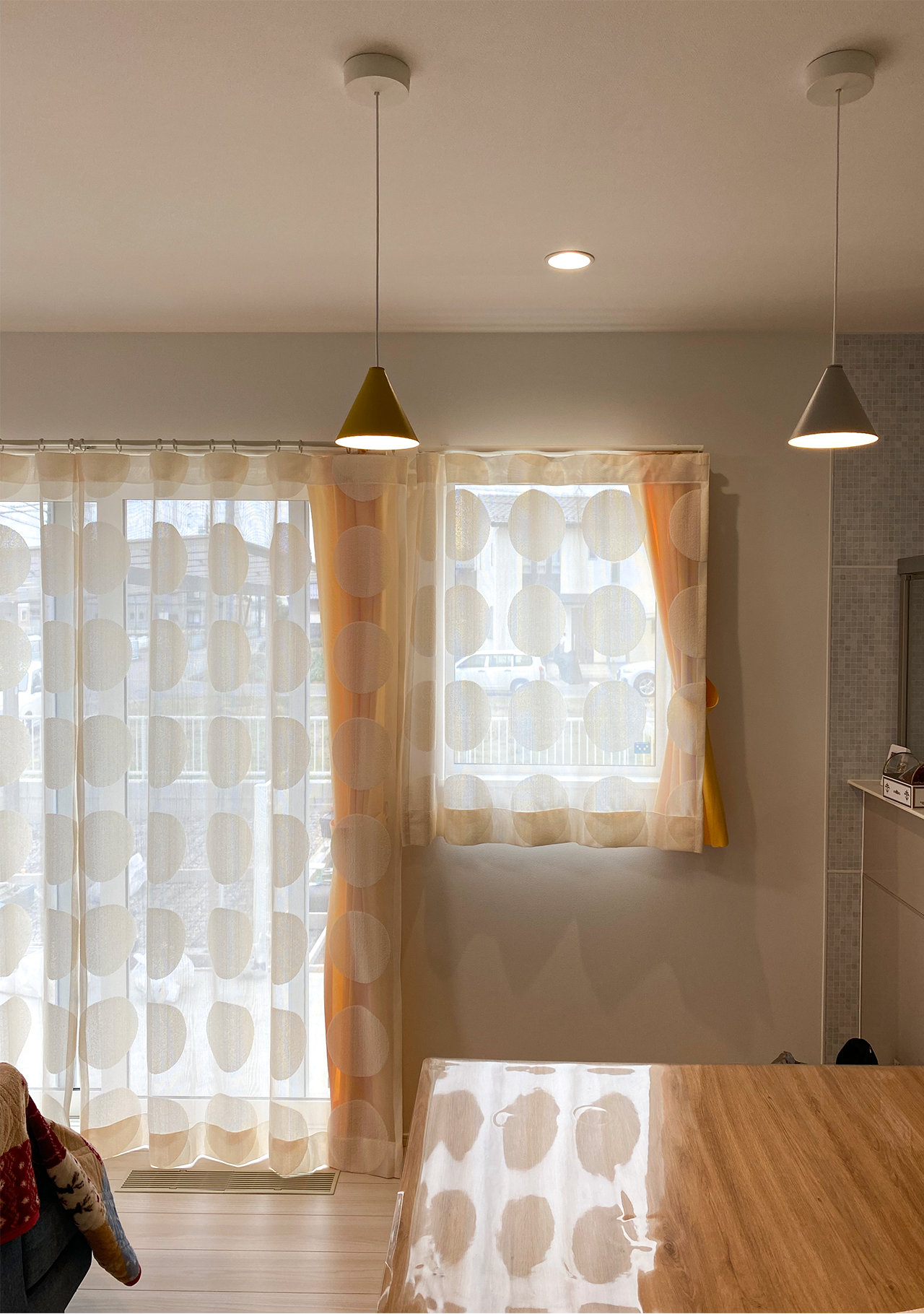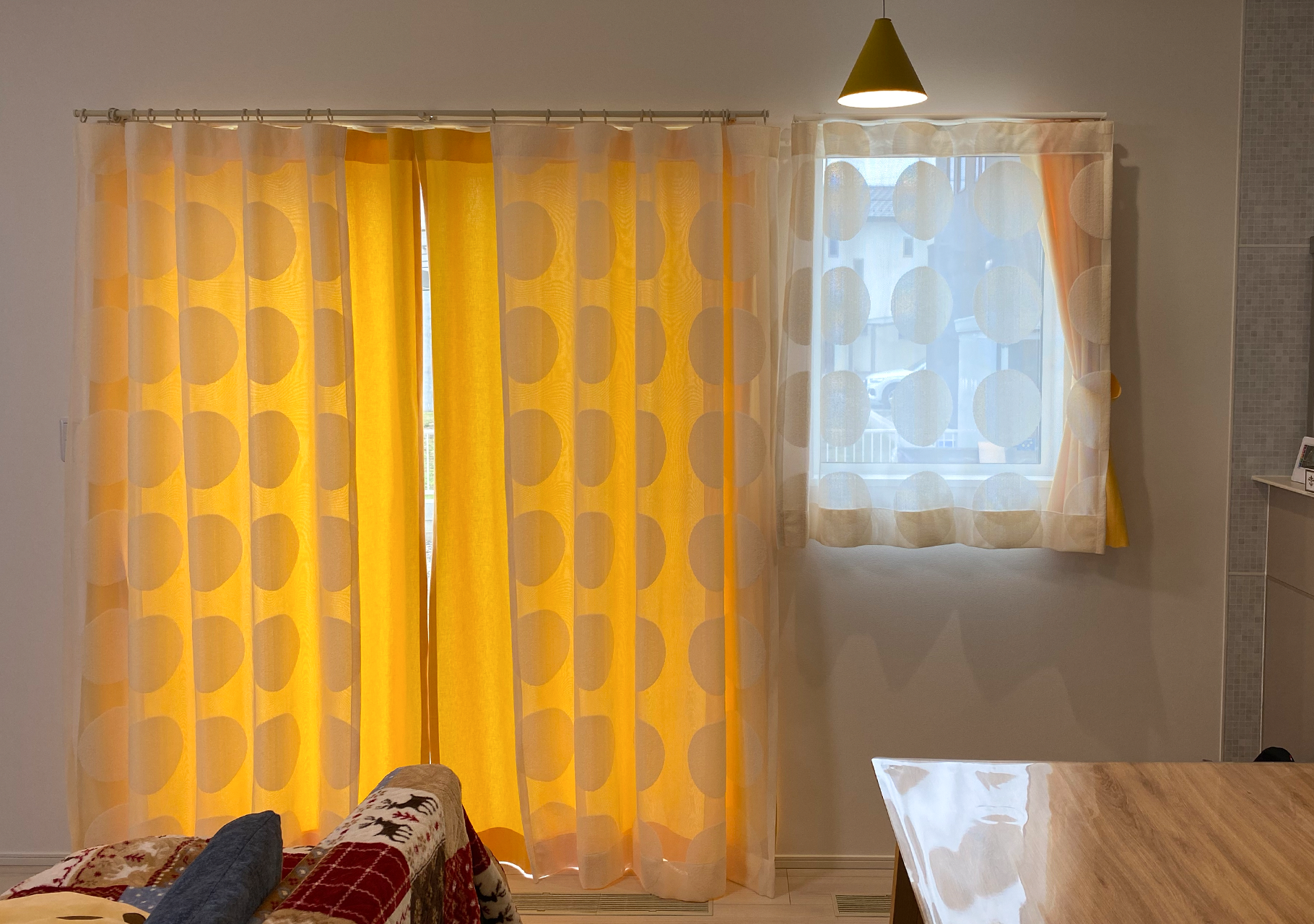 イギリスから入手した(イエローが鮮やかなコットン100%)ドレープ生地を窓側にし、テクスチャが効いたドット模様のレース生地を部屋側に、、、“フロントレース”と呼ばれている組み合わせになります。
