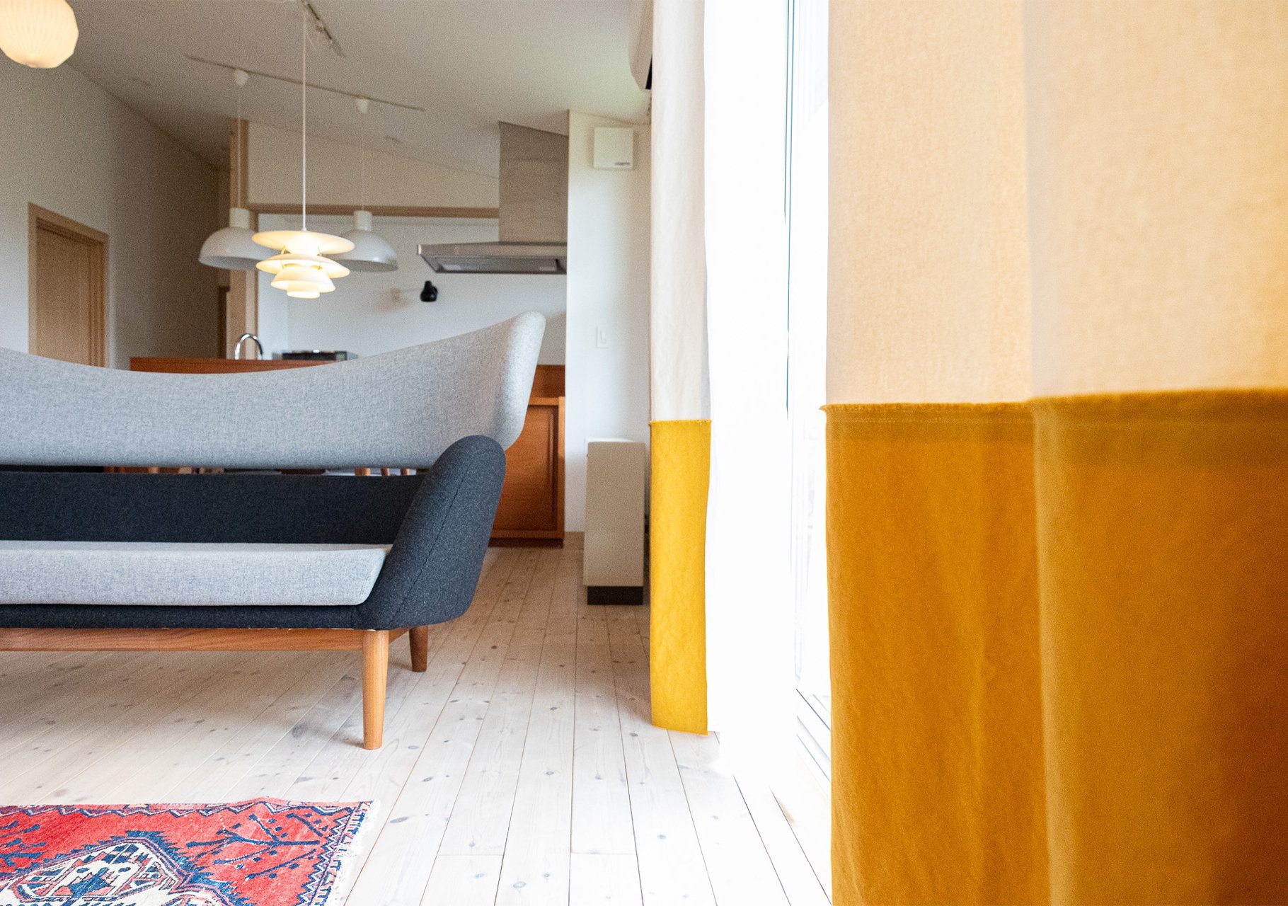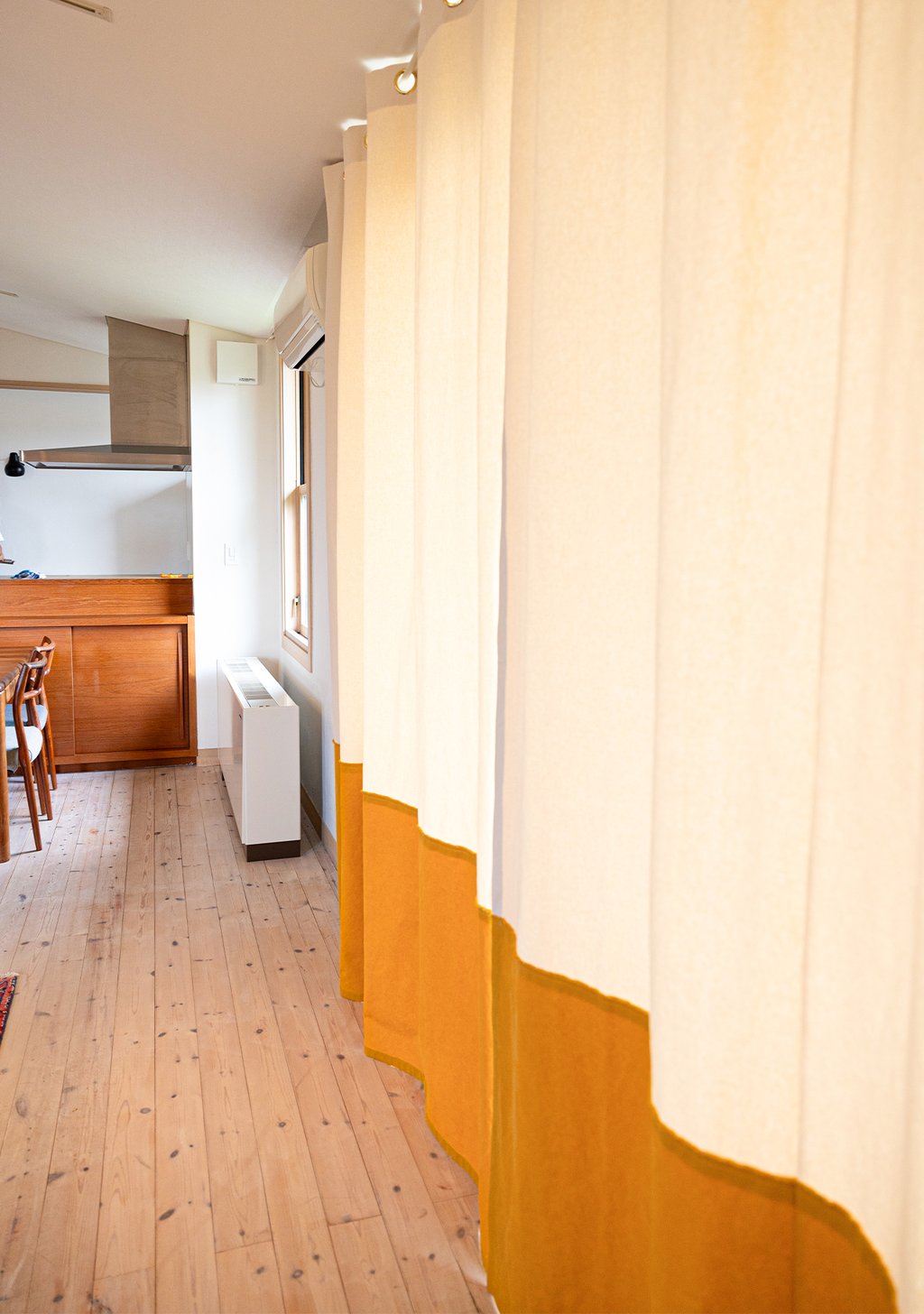 帆布カーテンの特徴でもある、バイカラー。上部は生成り色(001生成り)、下部は明るい黄色(023キツネ)で、7:3の割合になっています。この色の組み合わせが、北欧家具のナチュラルな雰囲気と相性抜群です。
