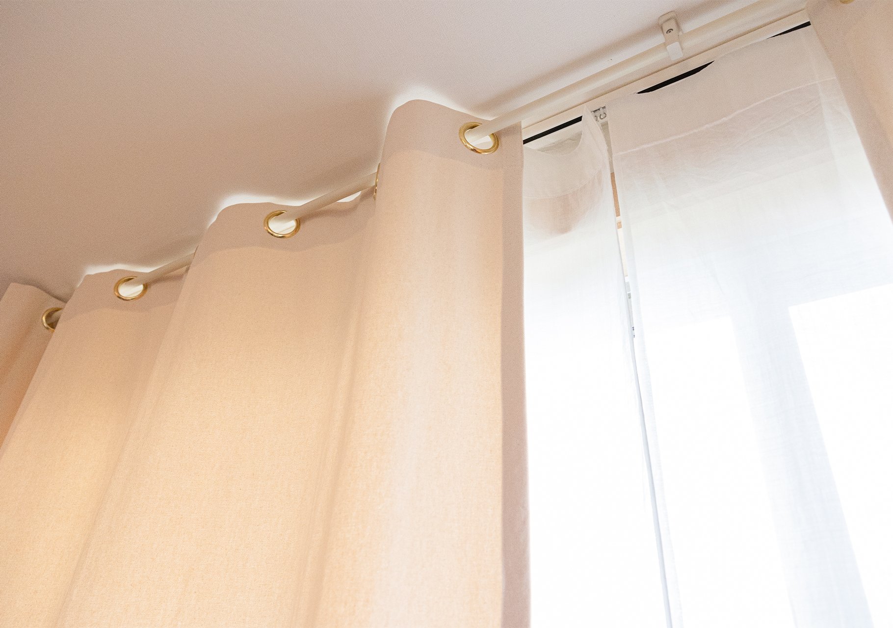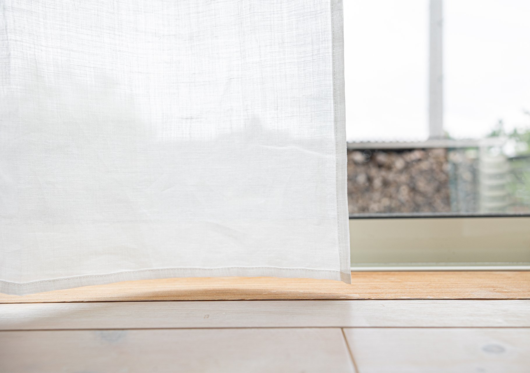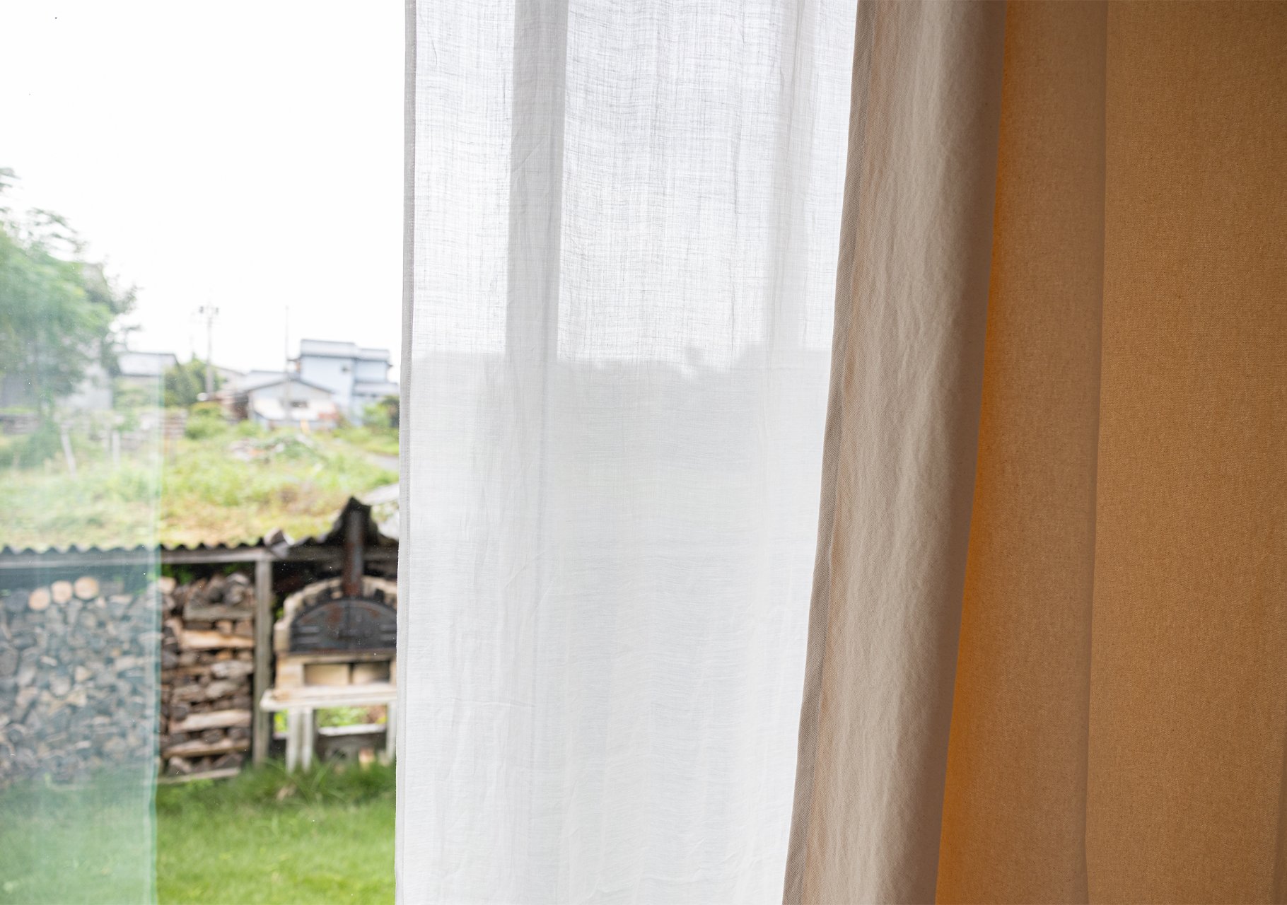 レースカーテンは、麻の一種であるラミー素材を採用。色は清涼感のあるオフホワイト、帆布カーテンとのバランスを取りながら、柔らかな光を取り入れます。