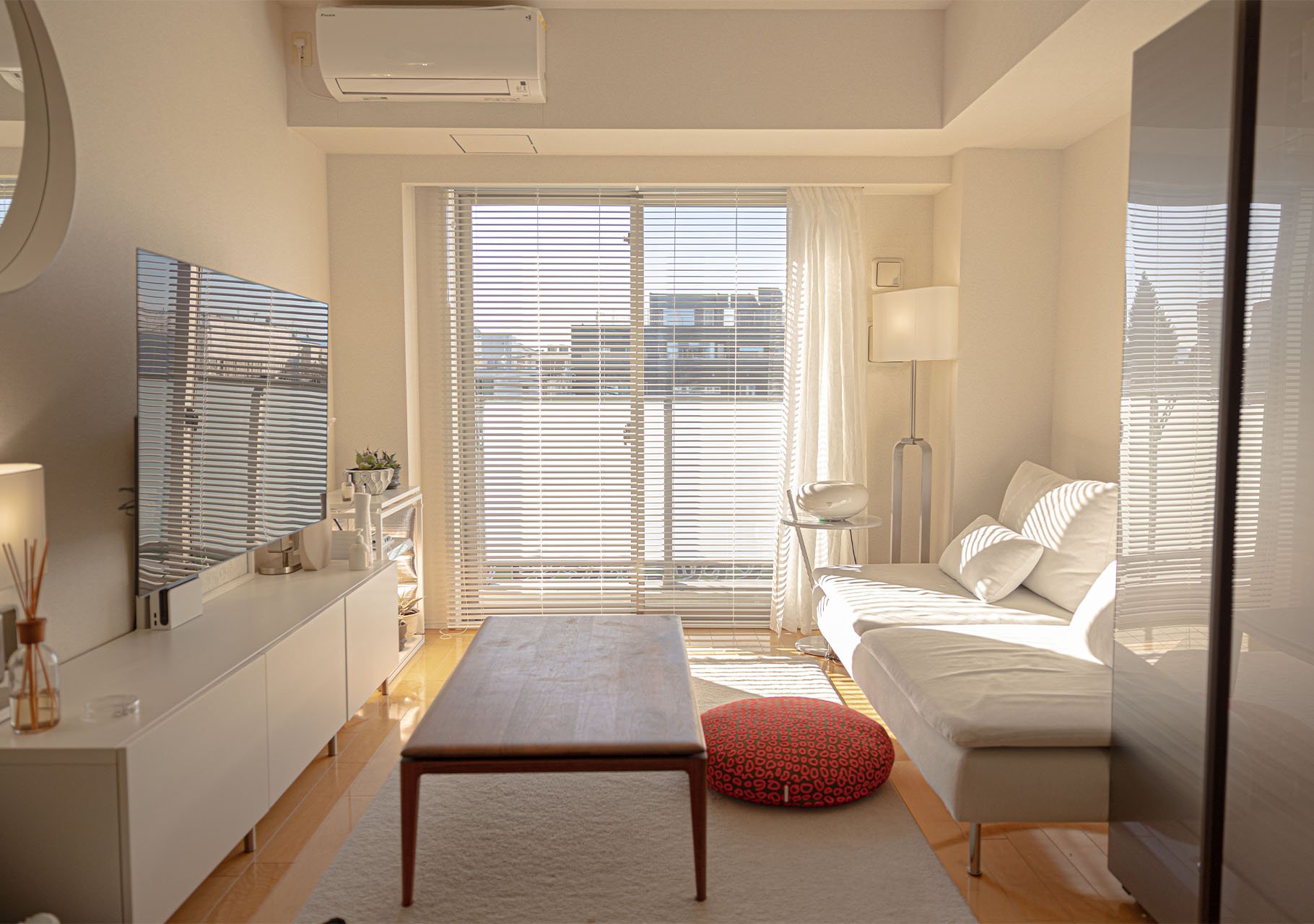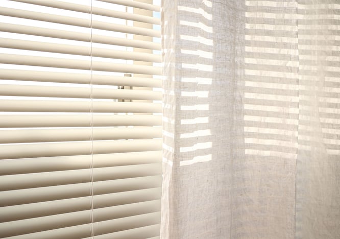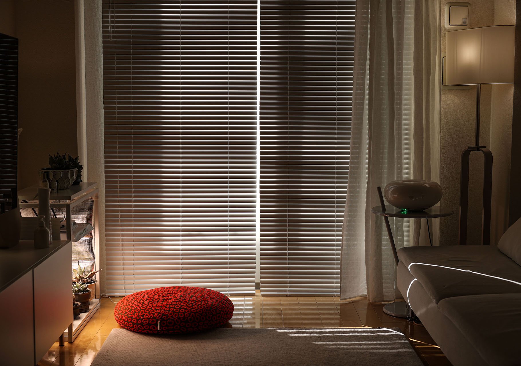アルミブラインドから入る光が、リネン生地と繋がり、居心地良い空間が部屋全体を包みます。夜も熱の遮断をリネン生地が繋いでくれますので欠かせません。