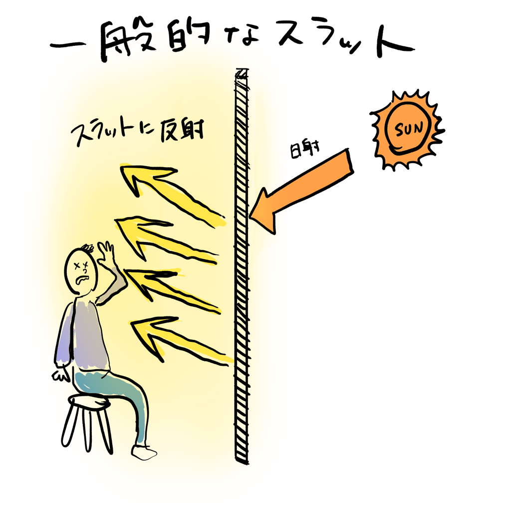 ③遮熱タイプのスラット(羽)で、あらゆる入射角度において光沢感を抑える。