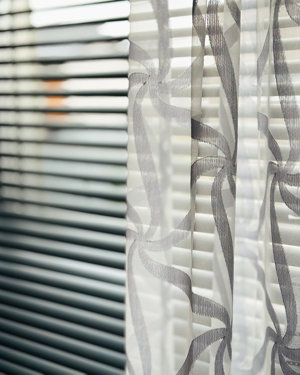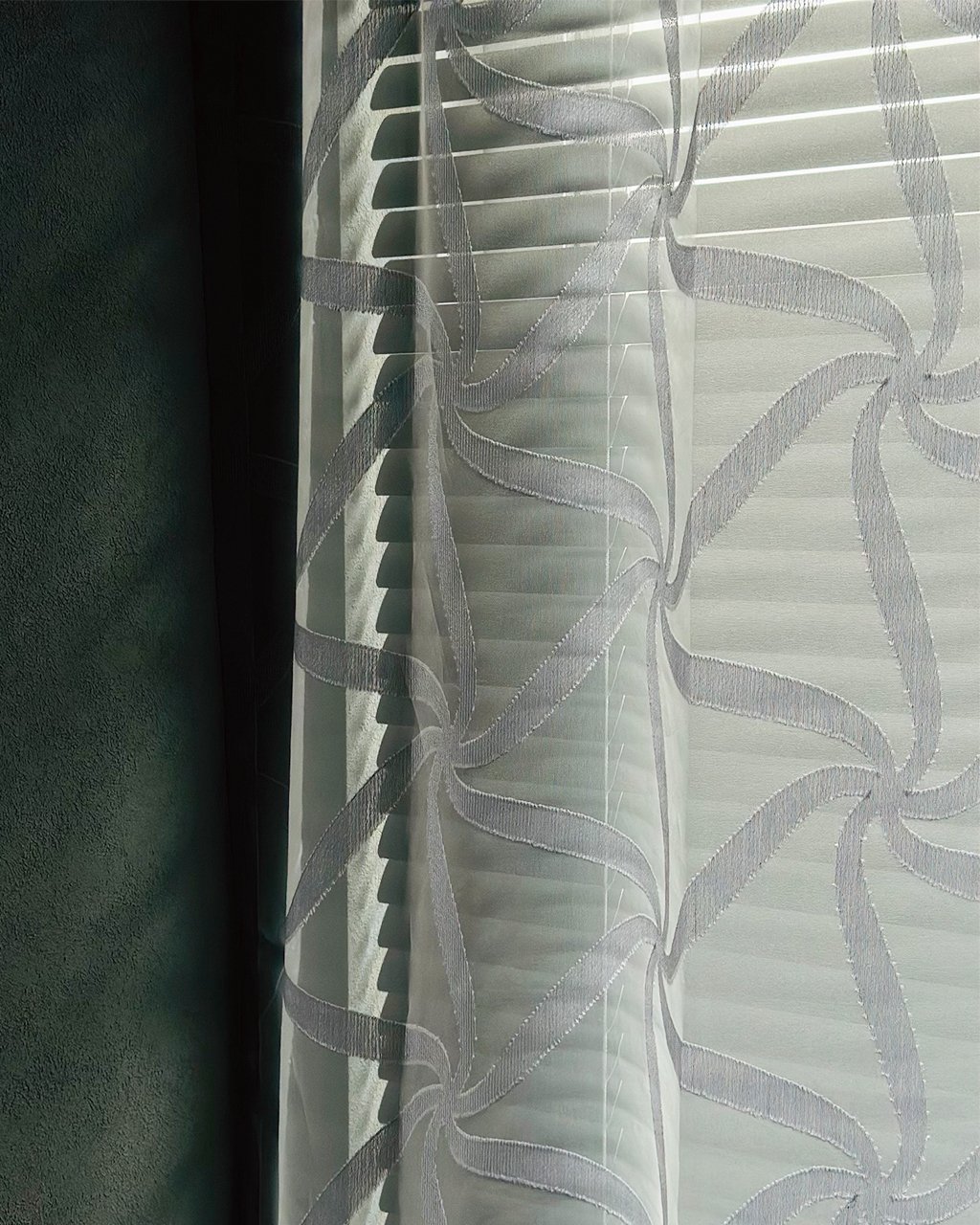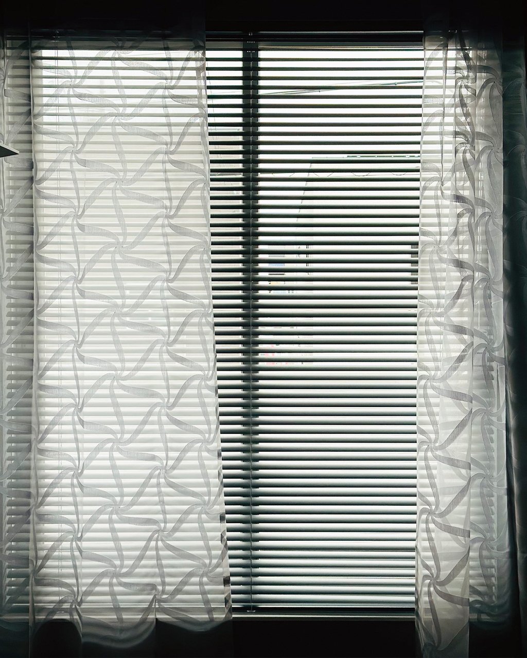 フロントレースはフジエテキスタイルさんの幾何学柄の刺繍レース、後ろはマットなアルミブラインドの組み合わせです。実はこのアルミブラインド、「ノングレア遮熱スラット」は、スラット表面に凹凸を持つ特殊な塗料を使用し、昼光を効果的に取り入れつつも、全ての角度からの入射光を拡散反射させ、不快な眩しさ(グレア)を抑制する特徴があります。