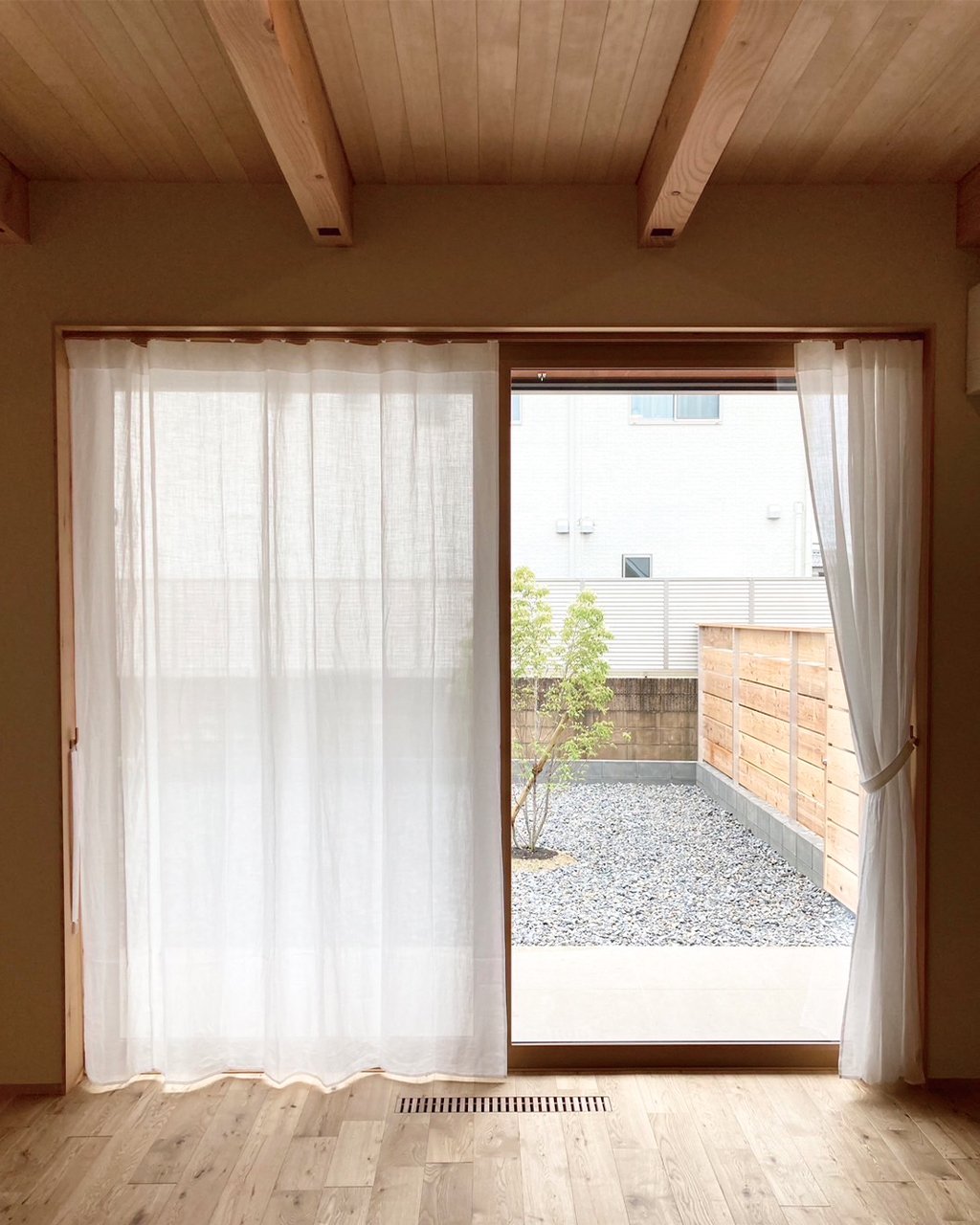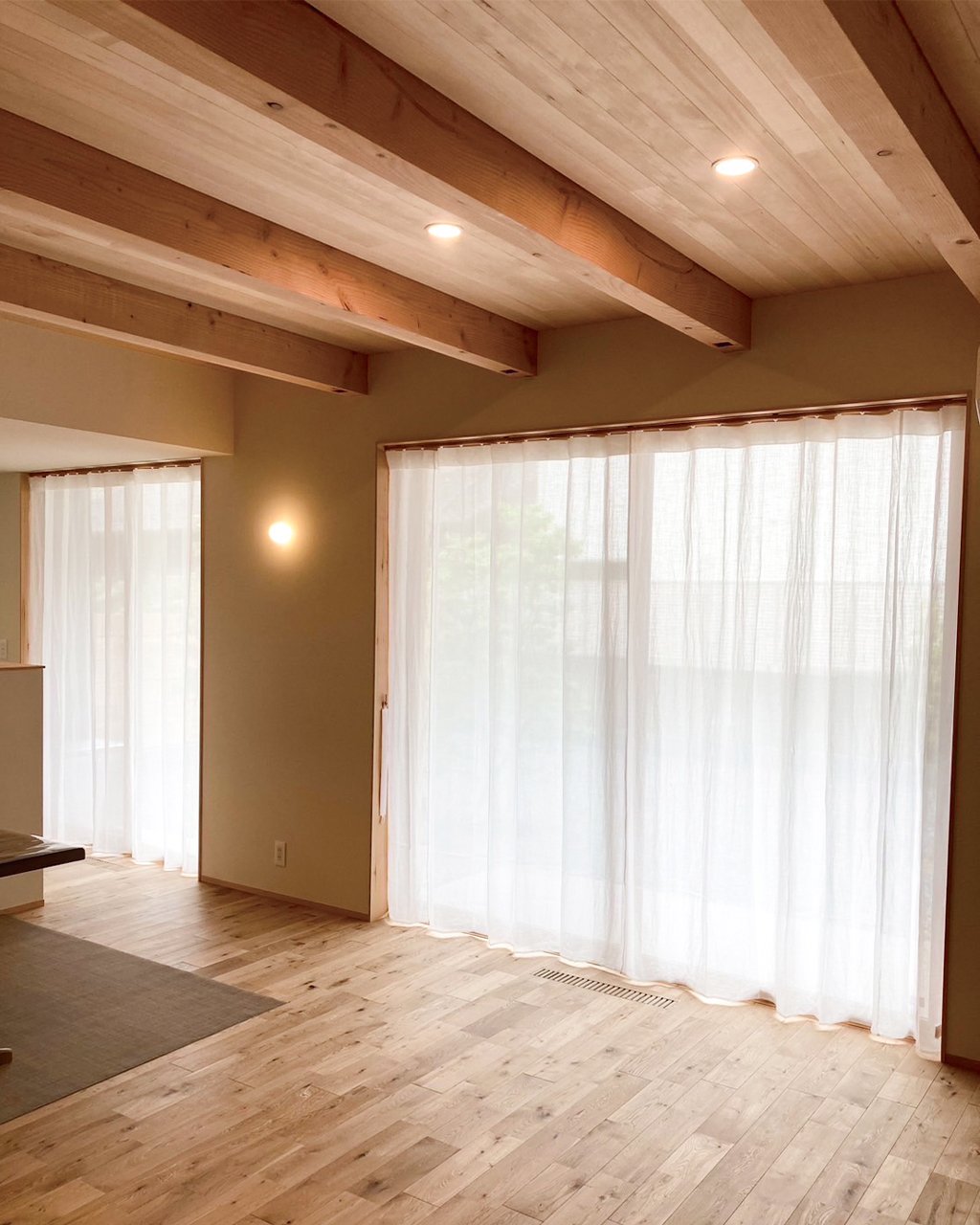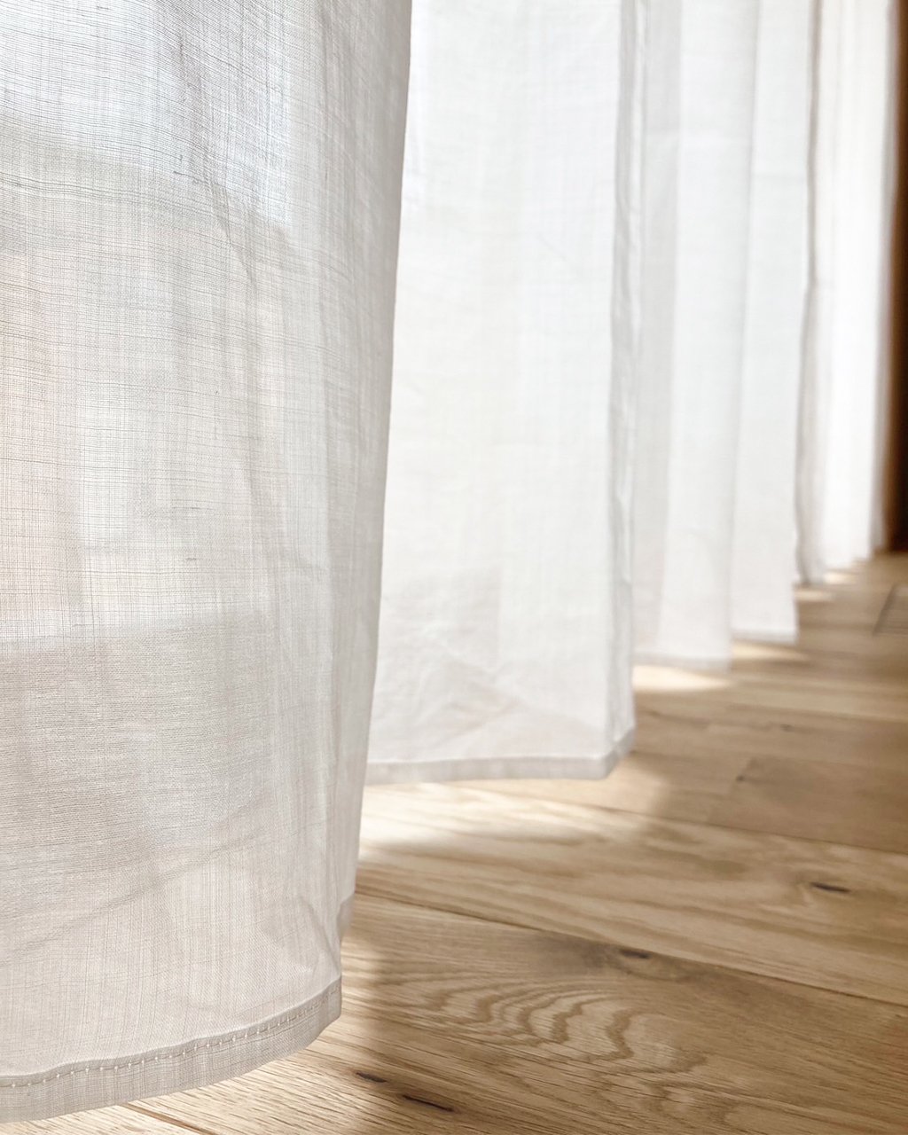 リビングの掃き出し窓と玄関に、希少性が高く機能性も伴う苧麻100%のレースカーテンを取り付けさせていただきました。
