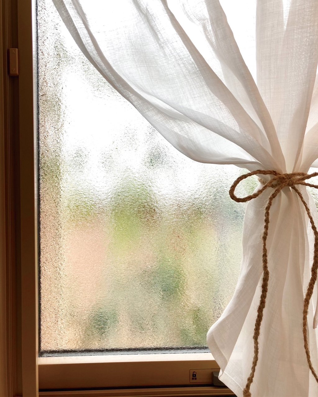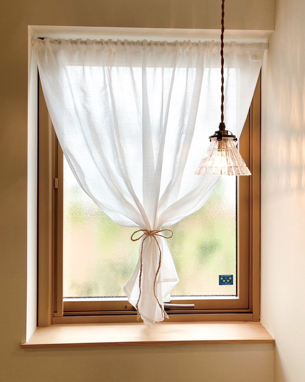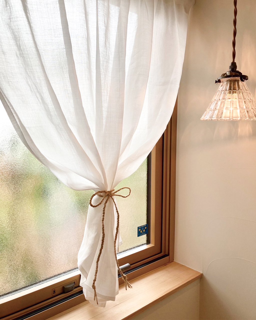 こちらの生地もリビングと同様、苧麻100%のレースです。スタイルはカフェスタイルになります。窓枠内に突っ張り棒で通し生地を寄せる仕様となります。上部になみなみができるのでアンティーク感やナチュラルな雰囲気を演出でき、麻紐でとめると雰囲気ばっちりです。素敵な照明に照らされてとっても素敵です。