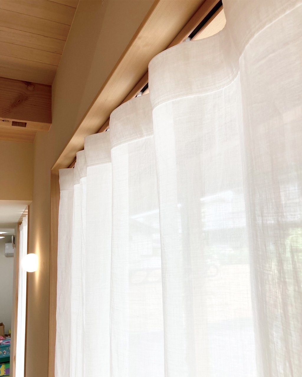 スタイルは天井付けのフラットスタイル(1.3倍)です。フラットスタイルとはヒダを作らず生地のゆとりで凹凸を作るスタイルです。木材に囲まれたインテリアなどナチュラルで優しい雰囲気を醸し出します。