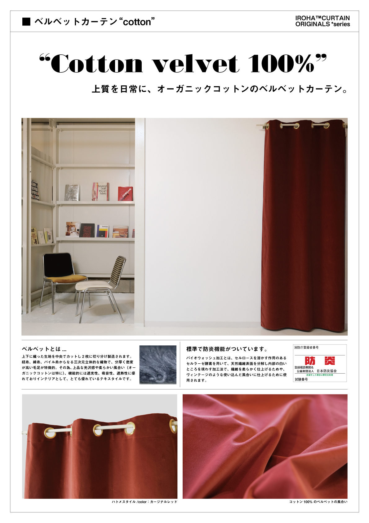 ハトメカーテンは、住宅だけでなく、商業施設や宿泊施設、店舗の間仕切りやしきりとしてもご利用いただいています。そうした環境では、安全性が求められることも多く、防炎加工に対応した仕様をご希望いただくケースも増えています。IROHAでは、ご希望に応じて防炎加工オプションをご用意しています。日本防炎協会基準に準拠した「防炎ラベル付き」で納品可能ですので、防災基準や施設管理の条件に対応できます。