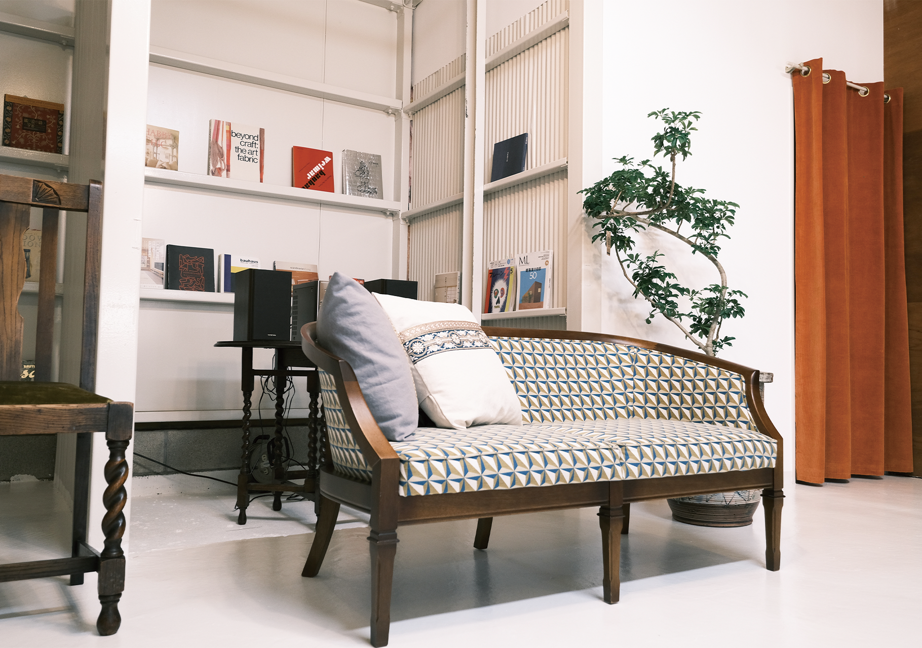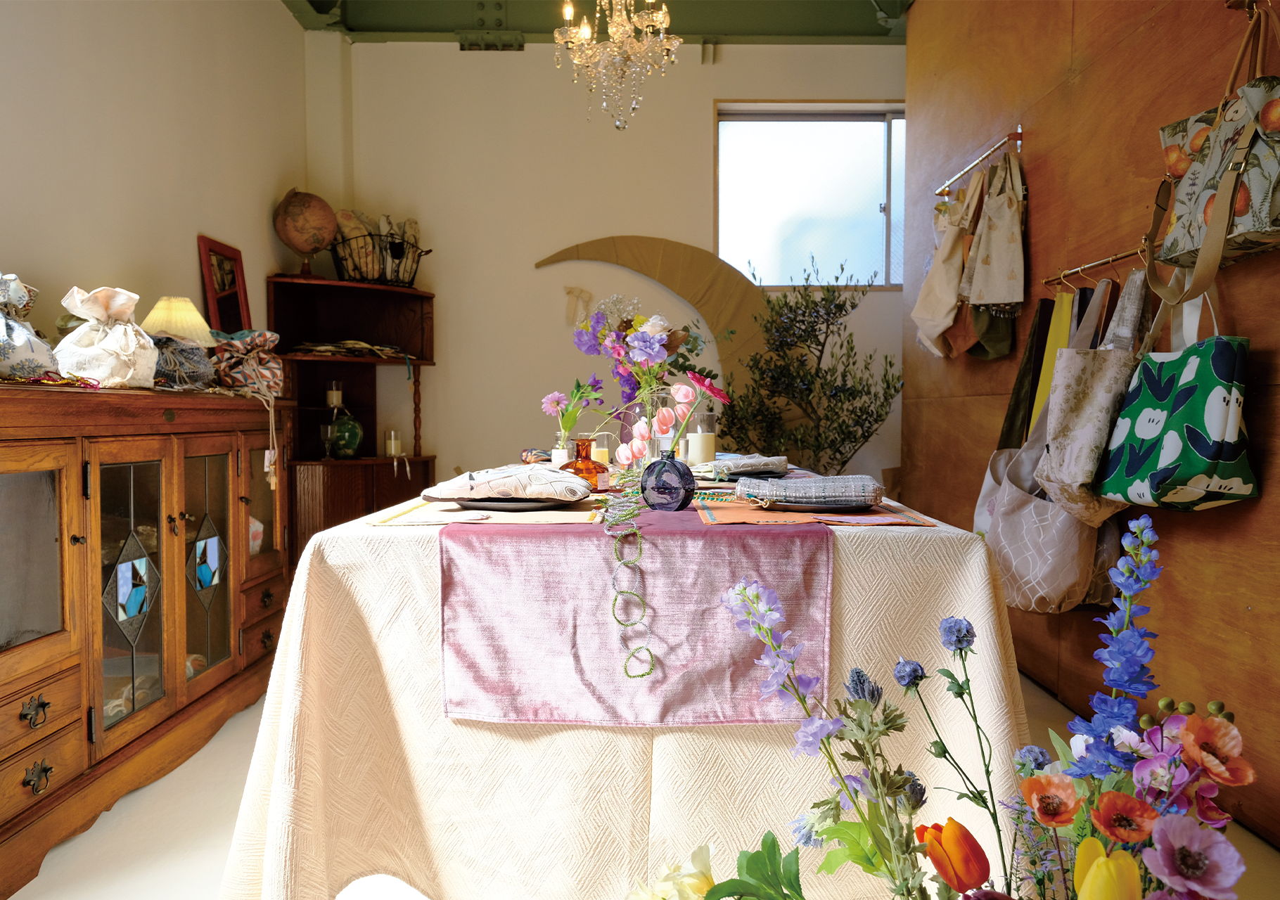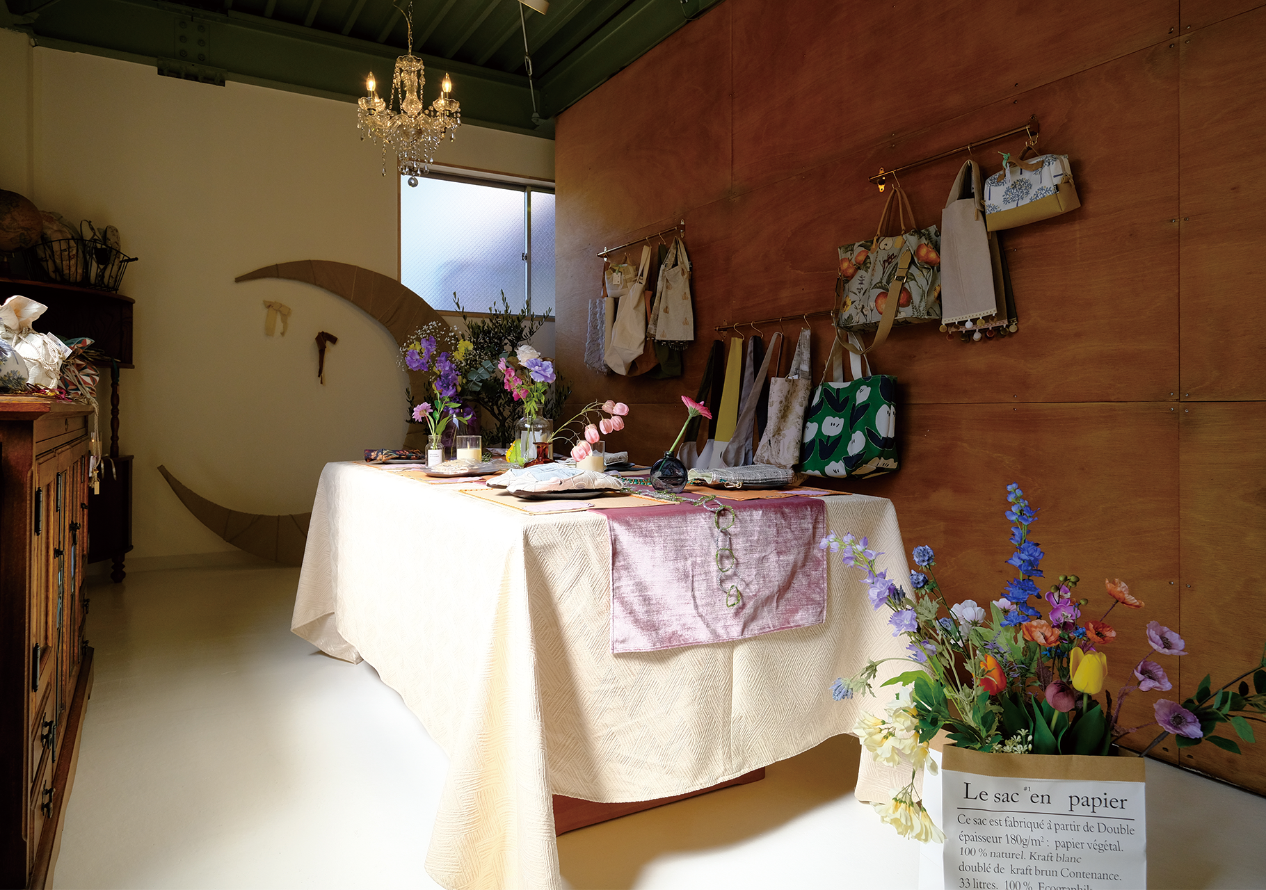 ショールームのお庭でカバンや、スリッパ、クッションなど販売しています。“持ち歩きたくなる雑貨”をコンセプトに、アトリエスタッフが丁寧な縫製で製作しています。