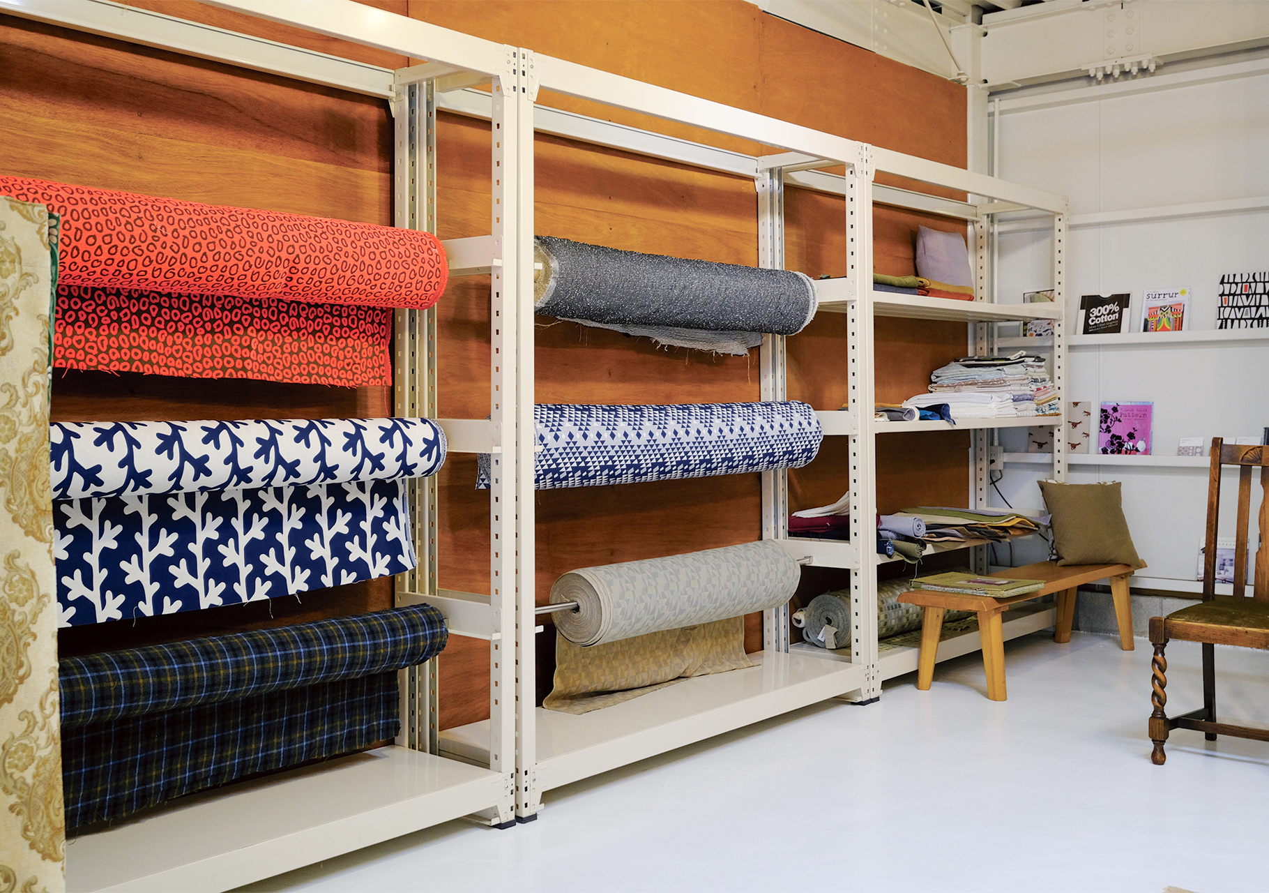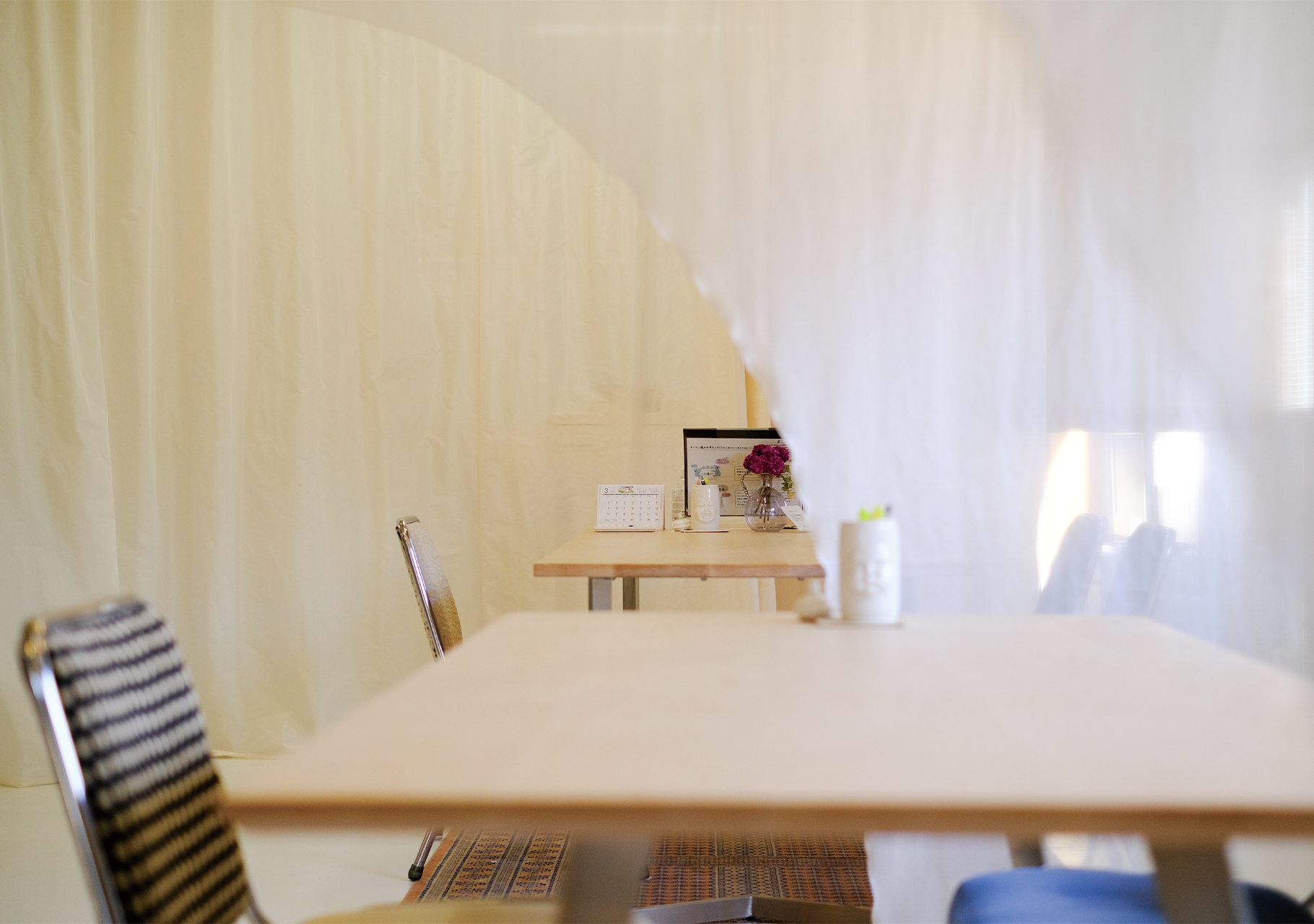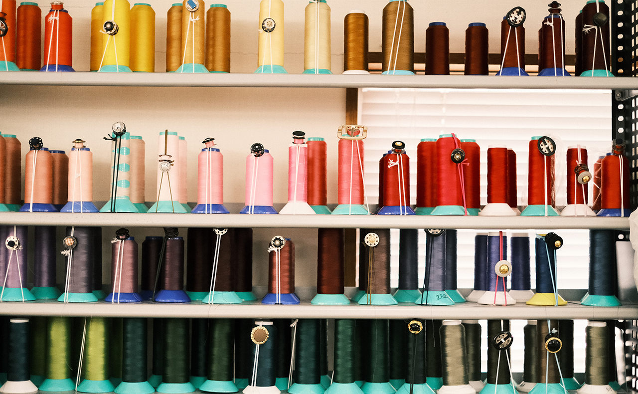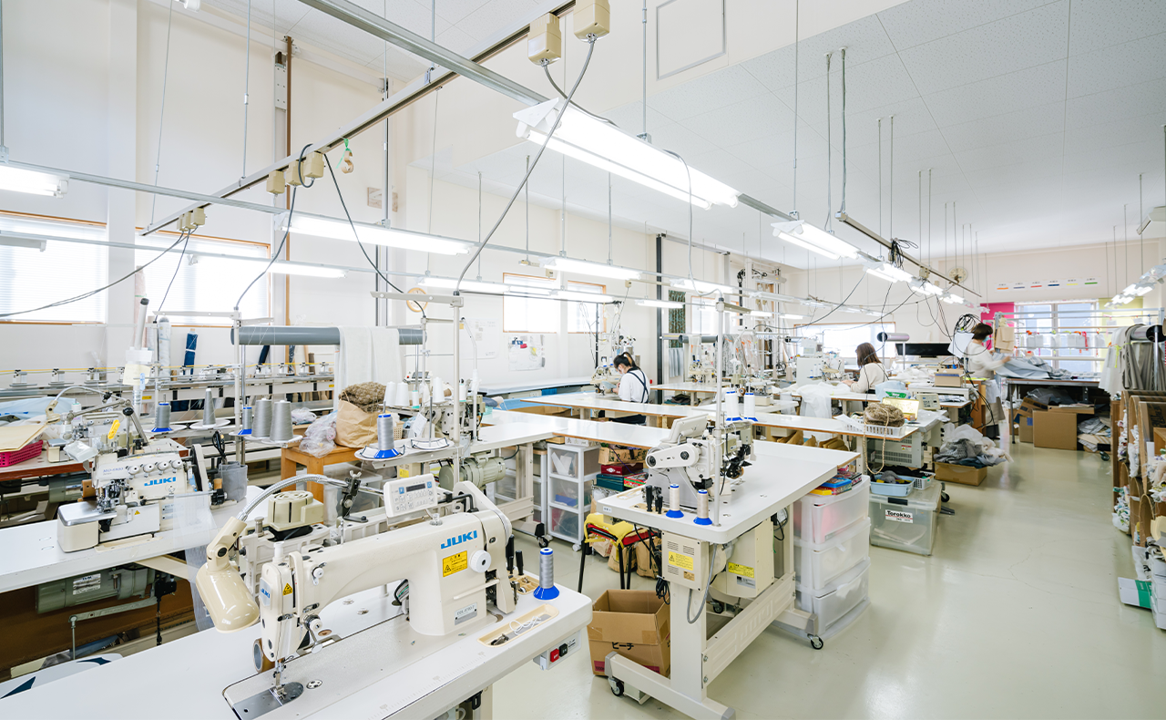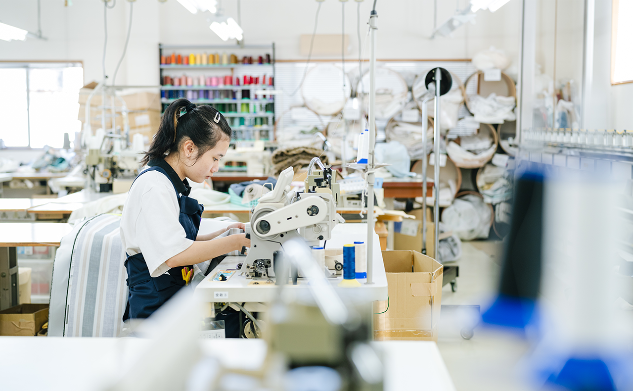 ショールームの2Fで、アトリエスタッフが一つ一つ迅速かつ丁寧に縫製いたします。一人のお客様のカーテンを複数人の手によってお作りしています。生地の色に合わせた糸を使い、タッセル、部品部分のハトメ、フック、糸、芯・・・など全て日本製。自社縫製なのでカーテン生地のチェックから縫製後の検品、梱包まで確実に仕立てます。全て安心してお任せください。