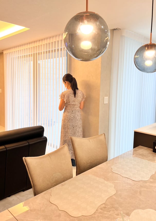 エアレの最大の魅力は、布のような質感と軽やかな透け感。一般的なブラインドの硬さがなく、風や光の動きにあわせて柔らかく表情を変えてくれます。昼は自然光を取り込みながら外の視線をやわらかく遮り、夜は照明の光をほんのりと受けて、穏やかで上品な陰影を描きます。