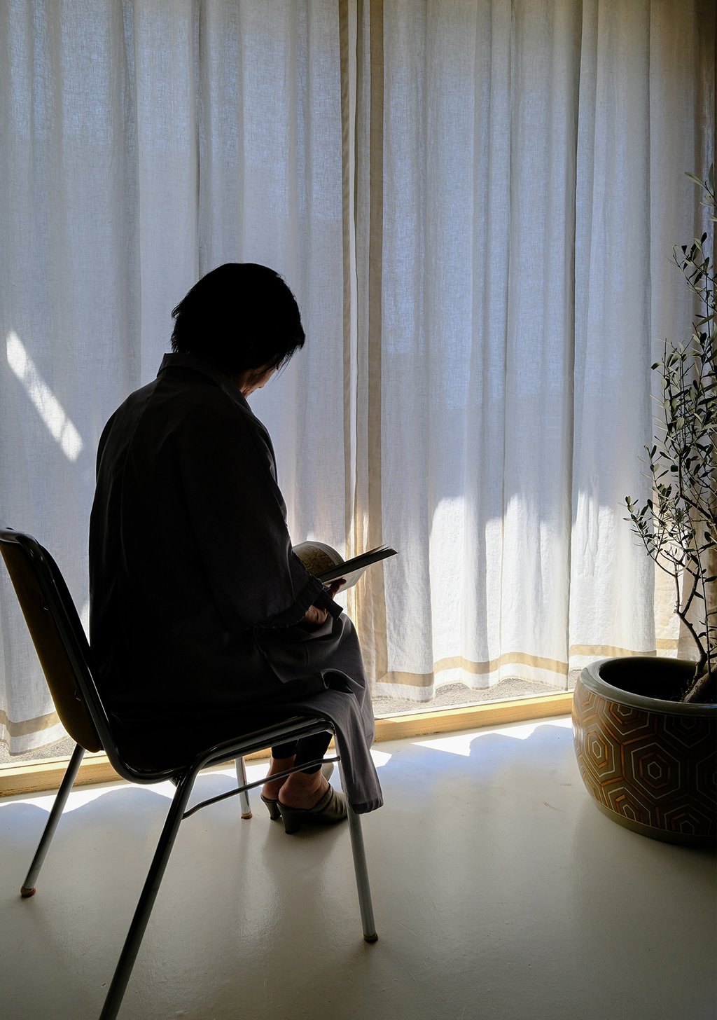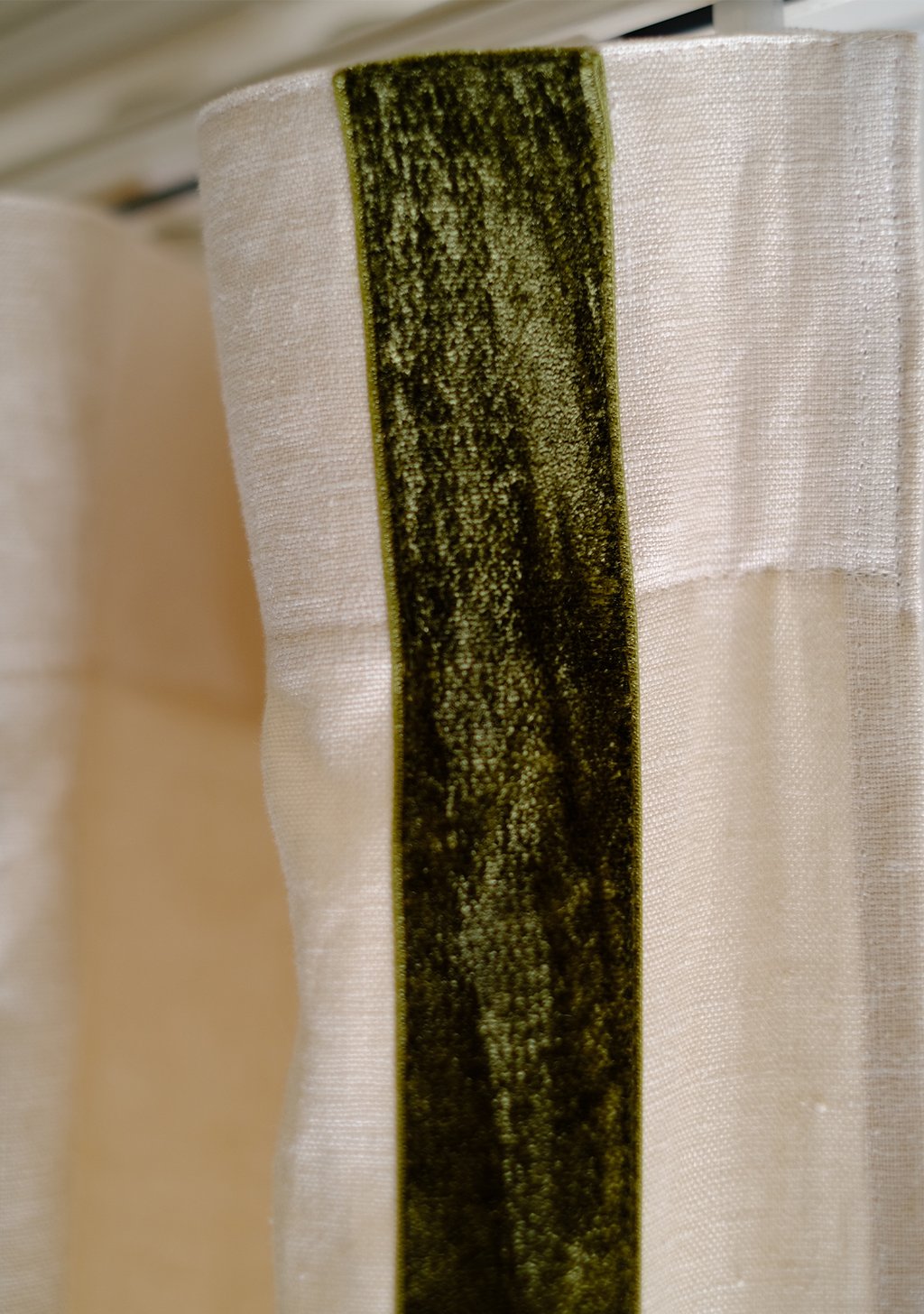 リネン生地の繊細な織り目と、艶やかなベルベットの質感。その対比が窓辺に立体感と深みを与えます。縁取りはコーナーまで丁寧に仕立てられており、近くで見るほど仕立ての美しさが際立ちます。光を受ける角度によってベルベットの色味は濃淡を変え、窓辺に静かな表情を添えます。