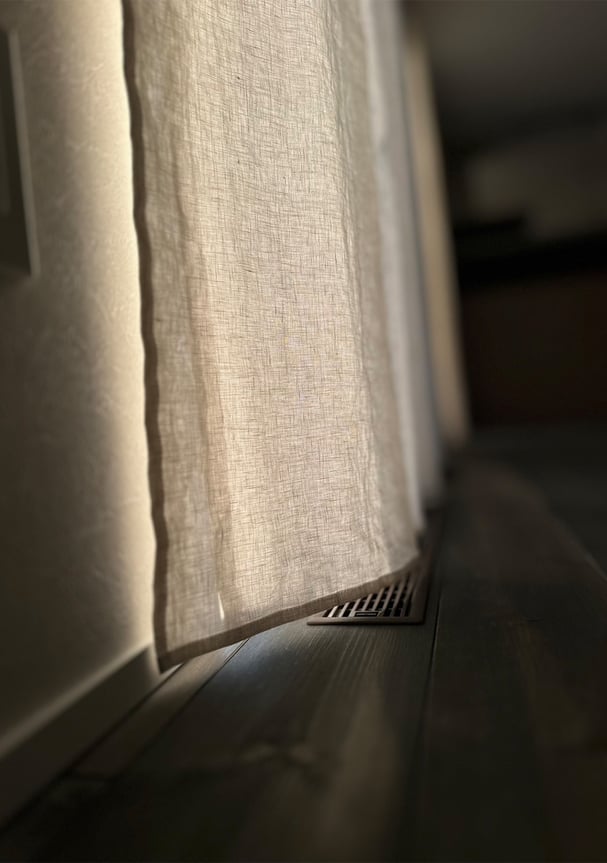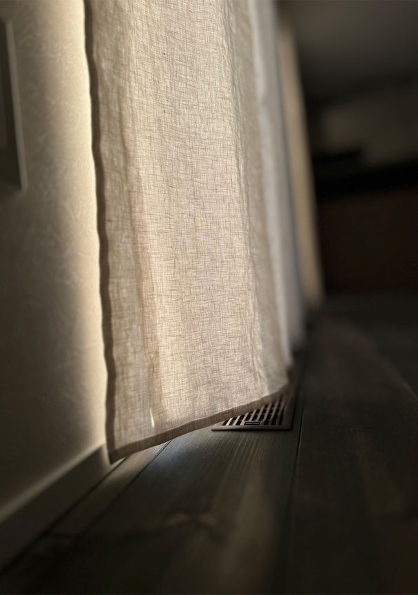 壁面からカーテンを掛ける正面付けスタイルは、窓全体を包み込むように見せることで、すっきりとした印象に仕上がります。リネンの軽やかな質感が、白壁や木の床と美しく調和します。