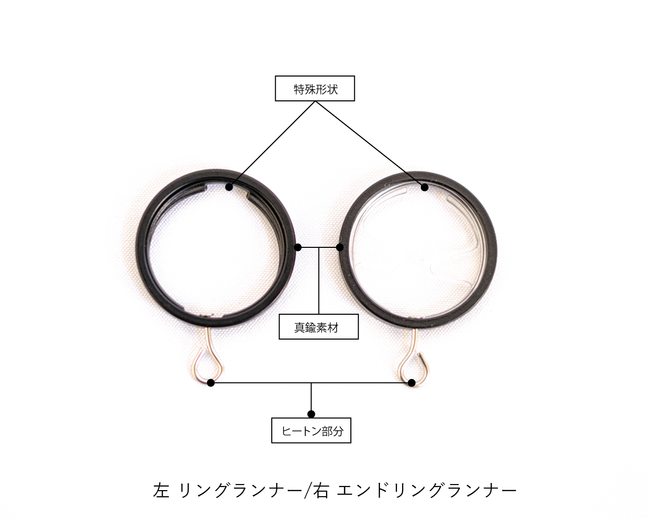 ヒートン部分が自由に回転し、特殊形状のインナーリングでリングが乱れず正面を向いて並び、エンドリングランナーでリングランナーの脱落を防止します。リングランナーの有無はオプションにより選択できます。