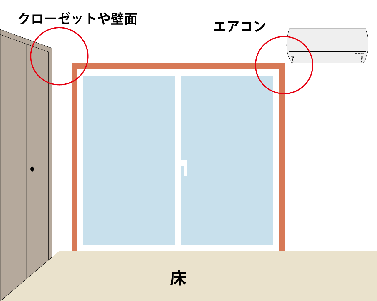 窓周りの状況からカーテンレールの取付に影響を与える障害(エアコン、クローゼットドアなど)の有無の確認や、カーテンレールをしっかりと固定するために下地が必ず必要です。