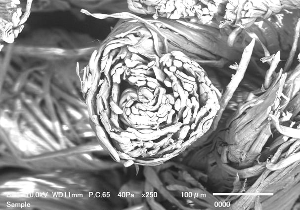 美濃和紙の繊維は、写真のように細かな層が何重にも重なり、空気をたっぷり含む独自の構造をしています。この“空気の層”こそが、調湿・通気性・抗菌性・消臭性といった機能の源で、湿度が高い季節もさらりとした快適さを保ち、においや細菌の発生を抑えてくれます。静電気が起きにくい性質も備えているため、ホコリが付きにくく、自然素材でありながら日常使いしやすい、清潔で快適なカーテン素材に仕上がっています。