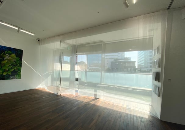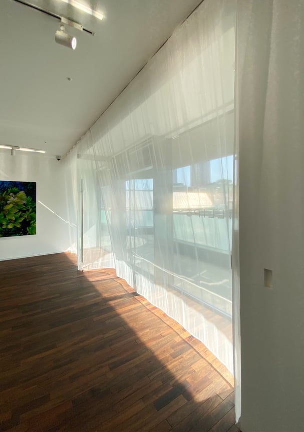 天井に埋め込んだカーテンレールボックスにより、布がまるで天井から直接落ちているように見える美しい納まりに。金具を見せないことで空間が広く感じられ、オーガンジーの軽やかさと建築の直線美が調和します。