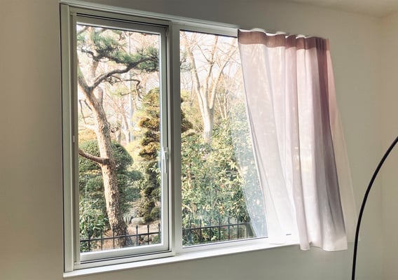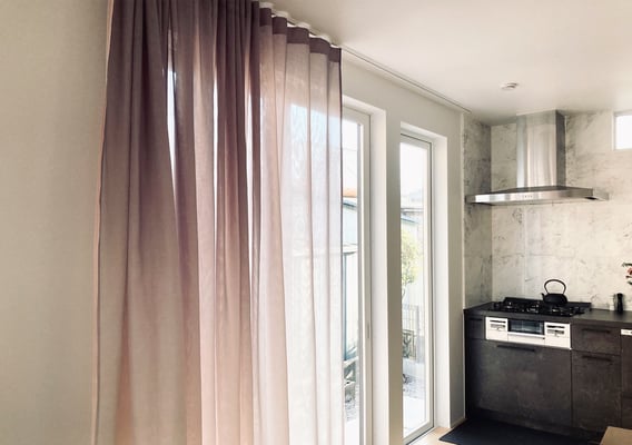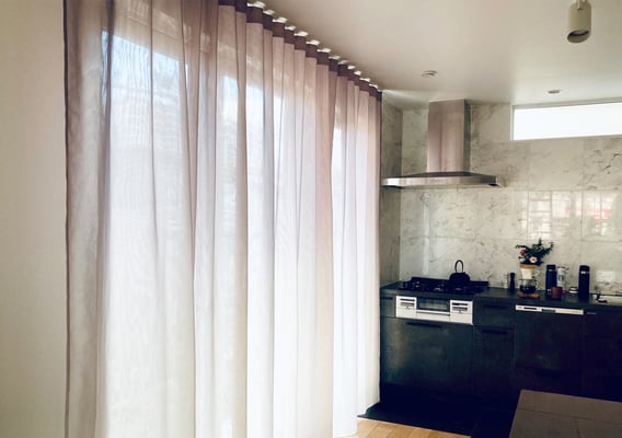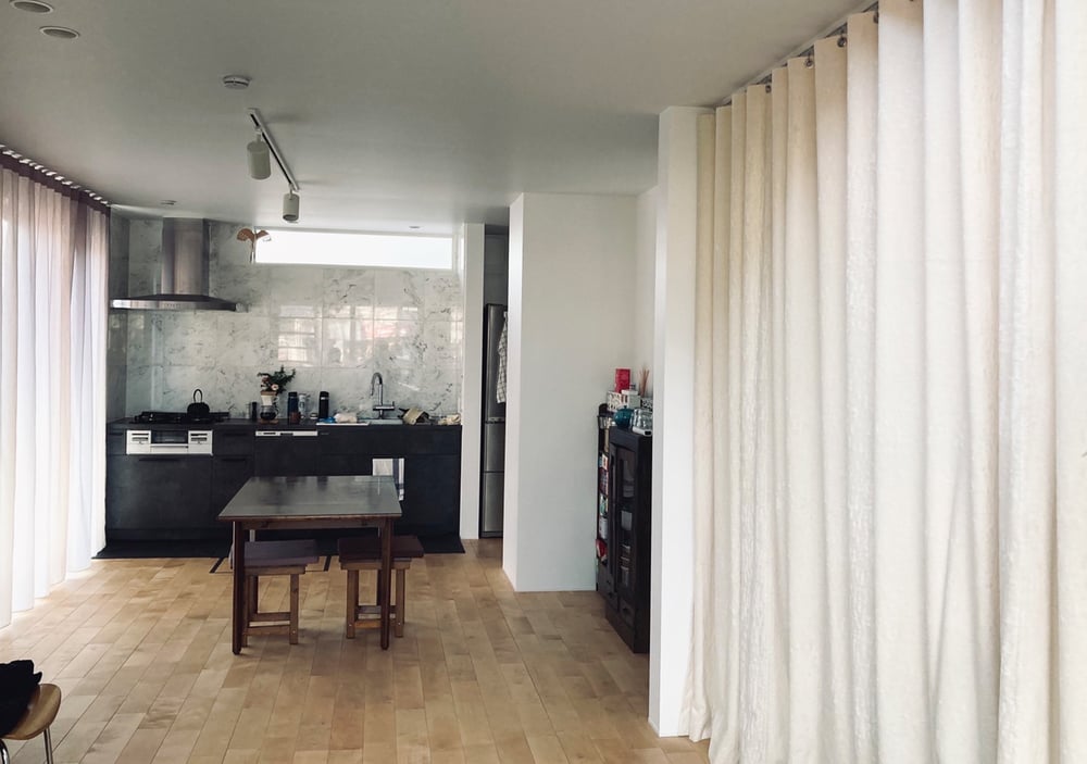 リビングの間仕切りには、ハトメスタイルのカーテンを採用。天井付けのレールに直接吊ることで、布が天井からまっすぐに落ちるようなダイナミックな印象に。