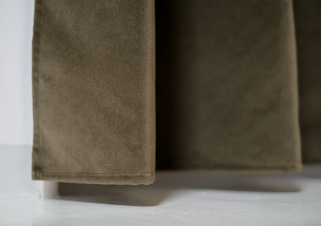 ベルベットは生地の密度が高く、分厚く、パイルを傾斜させることにより、高い遮光性を有しています。しかし色によっては遮光の効果に差が出ることがあります。濃い色のカーテンは光をより多く吸収し、遮光性が高まりますが、明るい色や薄い色は光をある程度透過するため、遮光の等級が低くなることがあります。このため、遮光カーテンとしてベルベットを選ぶ際には、カーテンの色選びが重要となります。お一人様3色までサンプル請求無料ですので、一度手に取ってご覧いただき、風合いや色合い、透過具合をご覧ください。