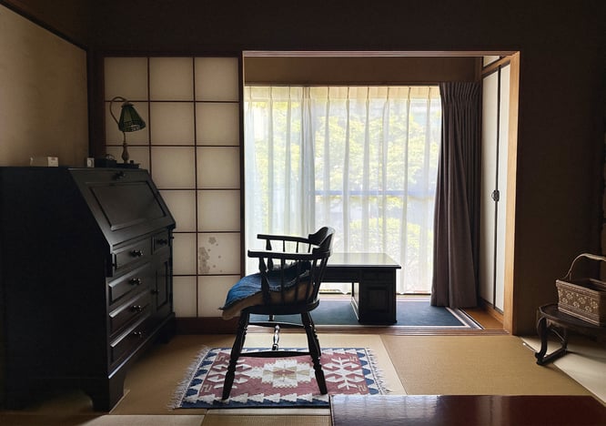 民藝品や工芸品に囲まれたお部屋に、外と中を繋ぐ役割のレースカーテン(いちご泥棒)の相性は抜群でした。